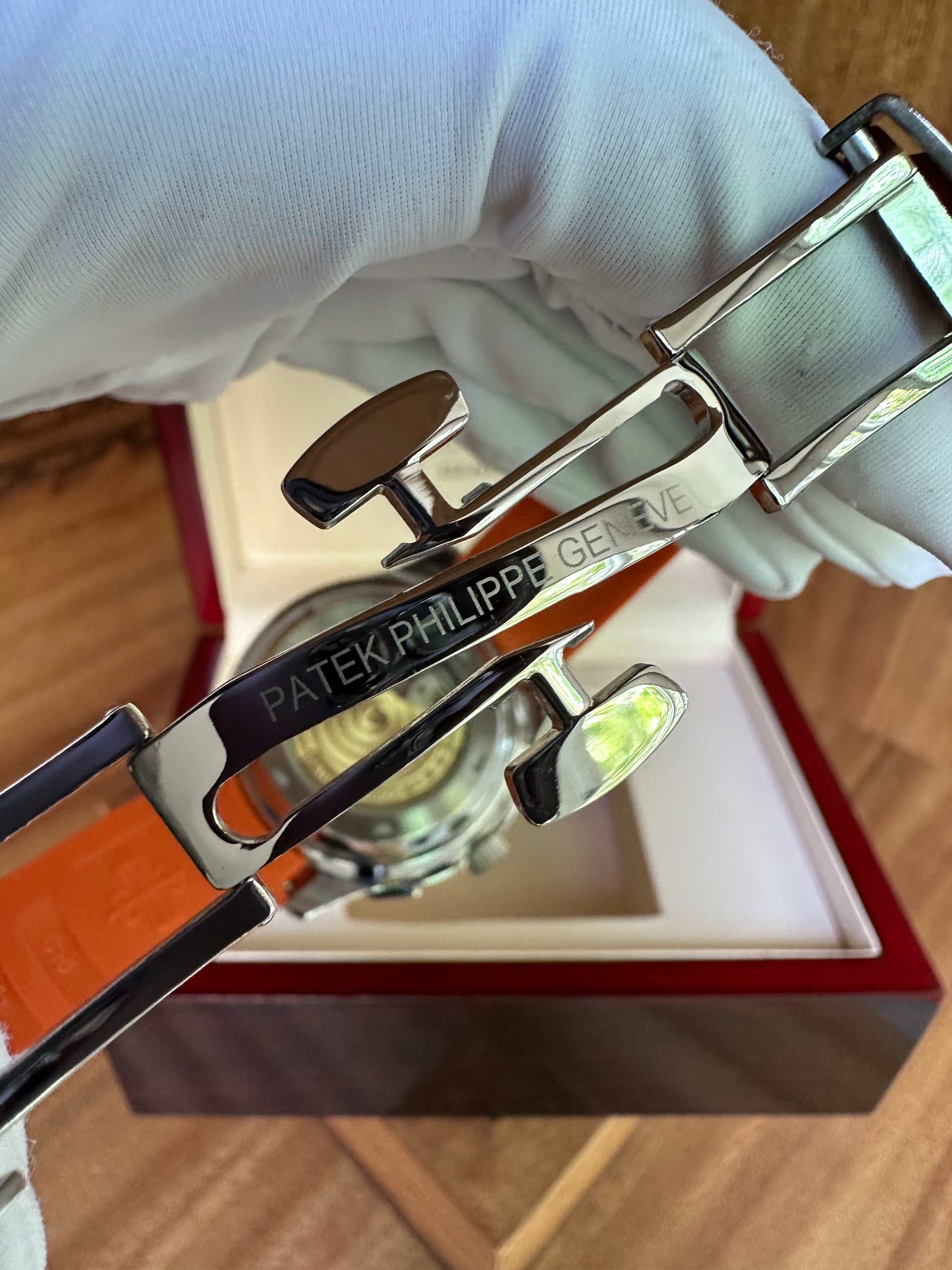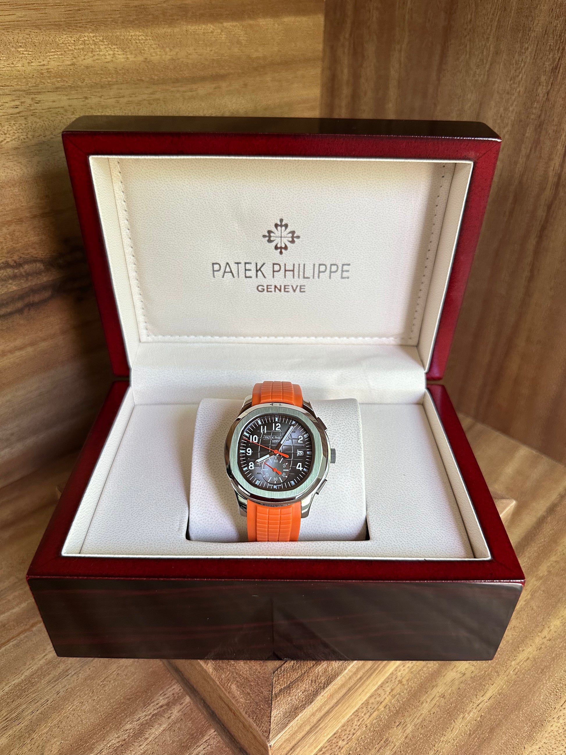 El Patek Philippe Aquanaut Chronograph con correa naranja y carátula negra destaca por su diseño enérgico y atrevido. El contraste entre el tono vibrante de la correa y la sobriedad de la esfera aporta una personalidad única, reforzando su carácter deportivo. Con la funcionalidad del cronógrafo y la identidad moderna de la colección, es una pieza que transmite dinamismo y exclusividad en cada detalle.