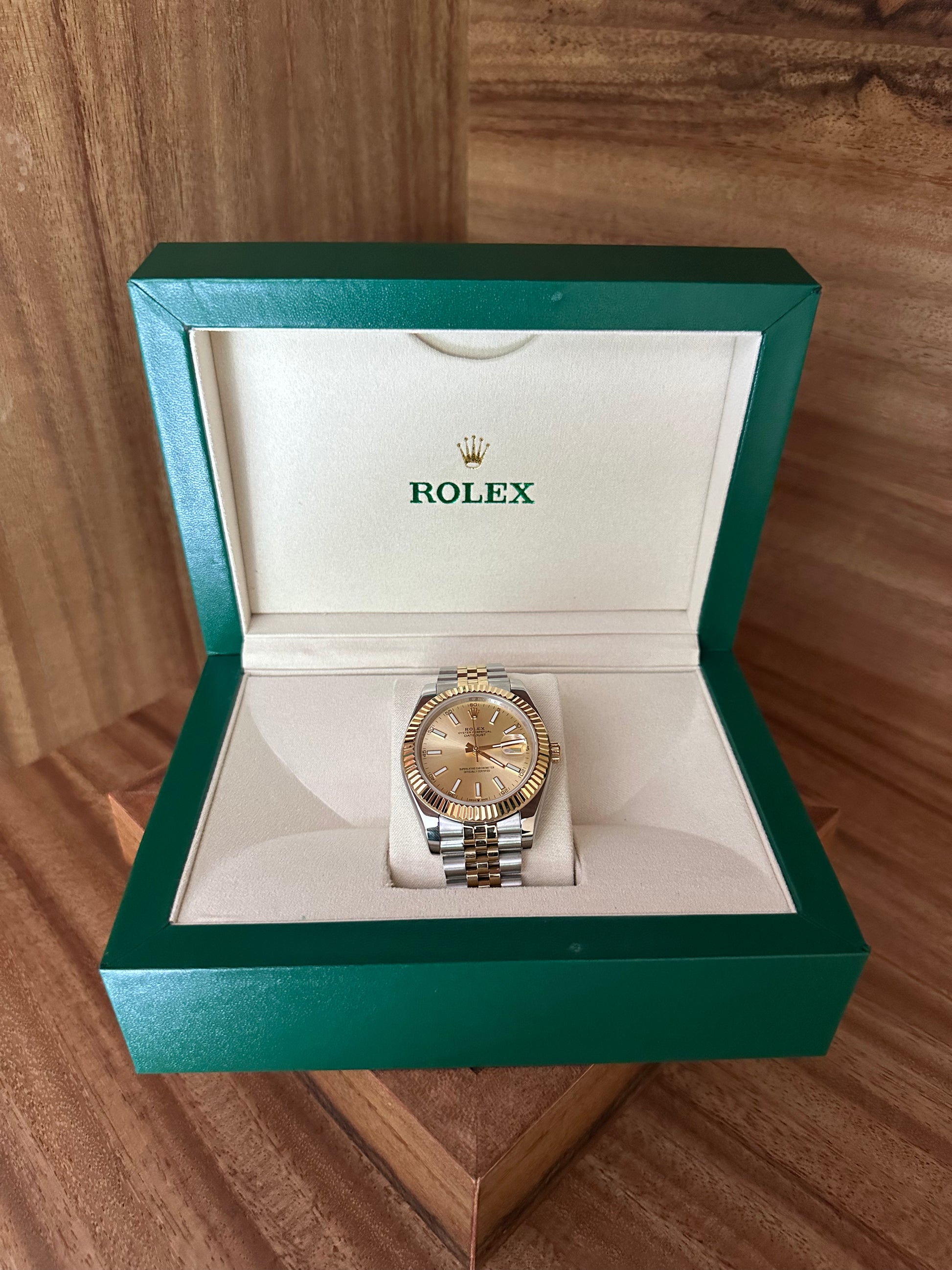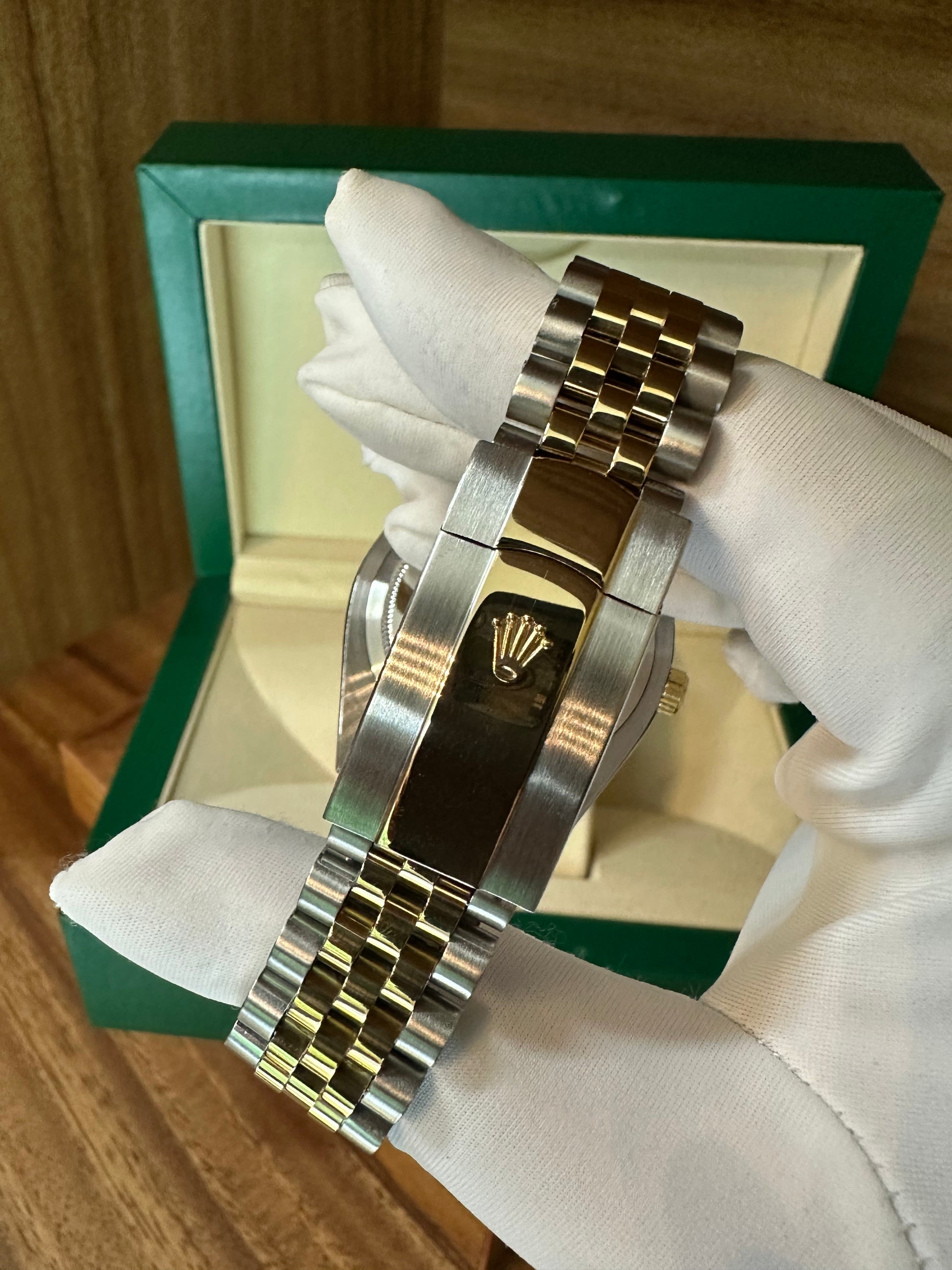 El Rolex Datejust Rolesor Yellow es un modelo que combina la elegancia clásica con la esencia atemporal de la firma. Su diseño resalta por la perfecta armonía entre el brillo cálido del tono dorado y la sobriedad del acero, creando un contraste sofisticado y versátil. La esfera, con su icónica ventana de fecha a las 3 horas, mantiene la identidad inconfundible de la colección Datejust. Su estética refinada, unida a la precisión de su movimiento automático y a la reconocida durabilidad de la marca, hacen de este reloj una pieza que se adapta tanto a un estilo formal como al uso cotidiano, proyectando distinción en cualquier ocasión.