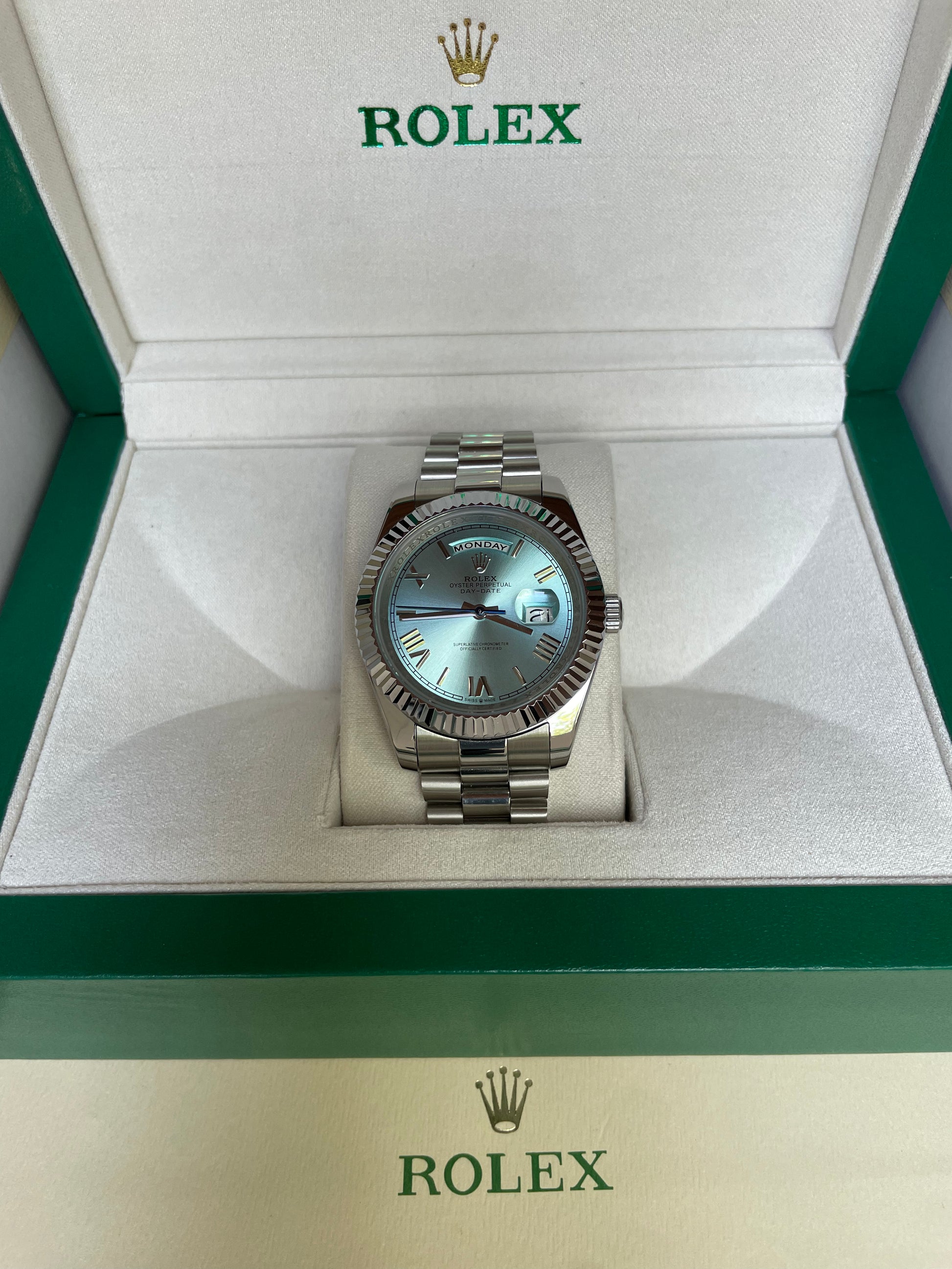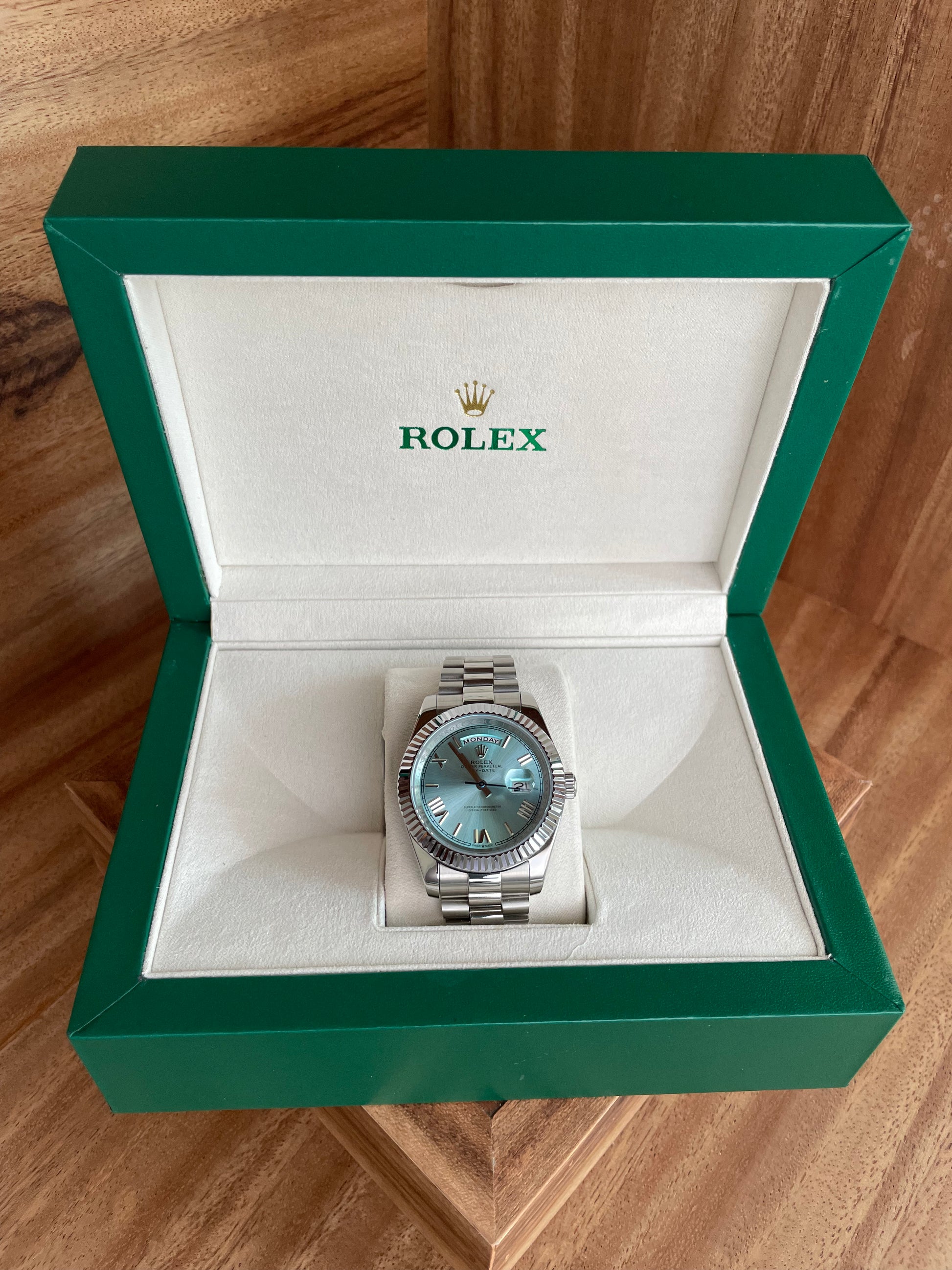 El Day-Date con esfera color Tiffany aporta una explosión de color a un ícono de elegancia. Su tono vibrante rompe con lo clásico, dando una nueva vida a un modelo históricamente asociado con el poder y el prestigio. Ideal para quienes quieren destacar con estilo y confianza.