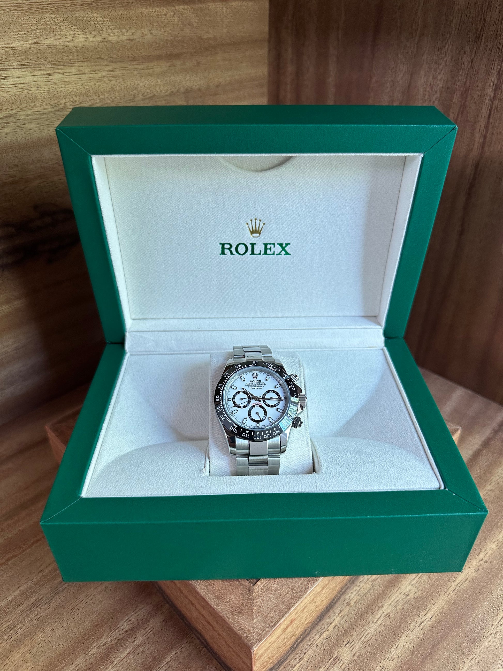 El Daytona Cosmograph con esfera “Panda” es uno de los relojes más codiciados de la relojería moderna. Su distintiva carátula blanca con subesferas negras resalta a primera vista, ofreciendo un contraste deportivo y elegante al mismo tiempo. Diseñado para el mundo de la velocidad y la precisión, incorpora el cronógrafo de alta fiabilidad y la emblemática escala taquimétrica en el bisel. Este modelo no solo es una herramienta de medición, sino también un símbolo de exclusividad y estilo, perfecto para quienes buscan un reloj con carácter y fuerte presencia.