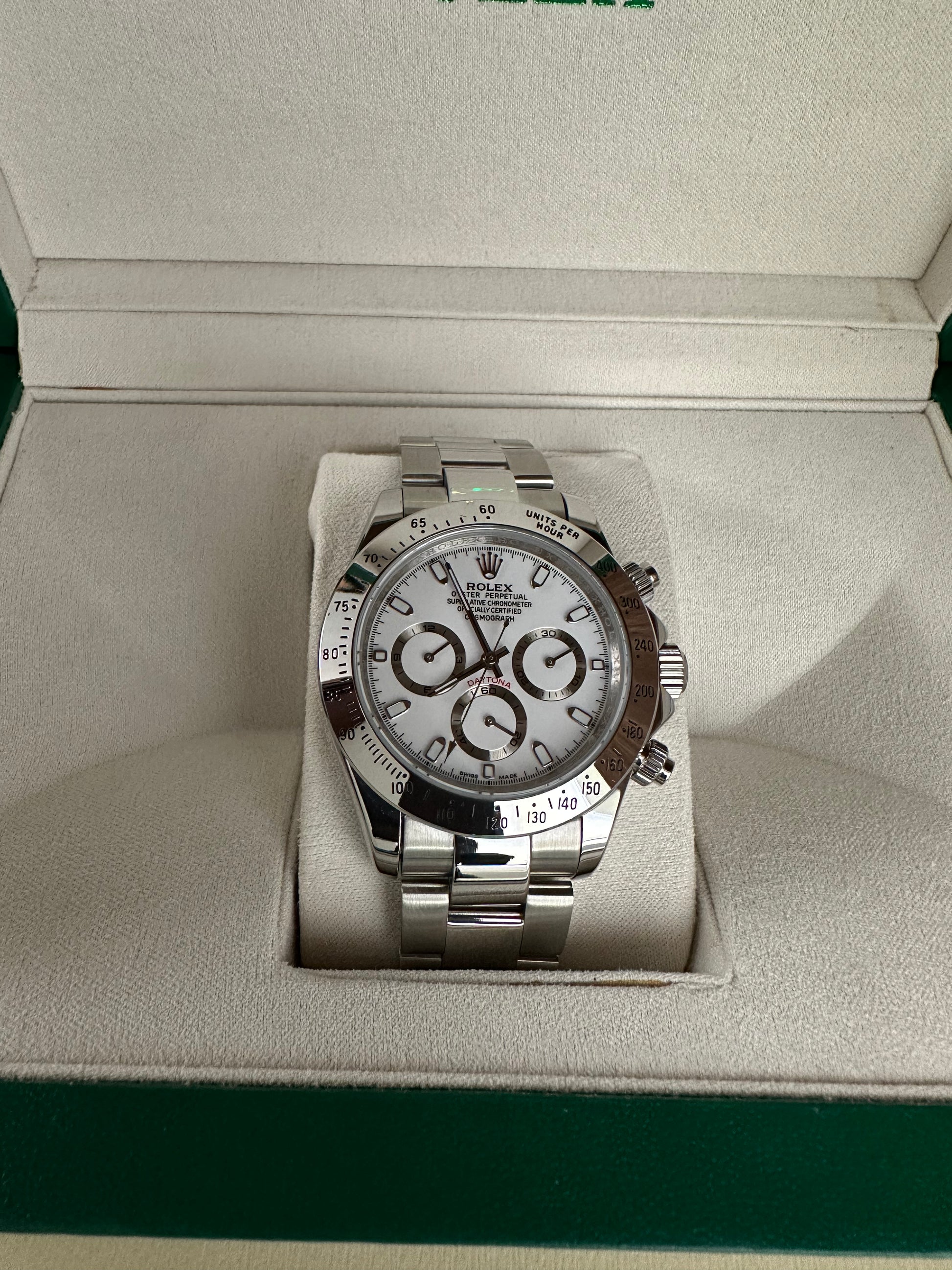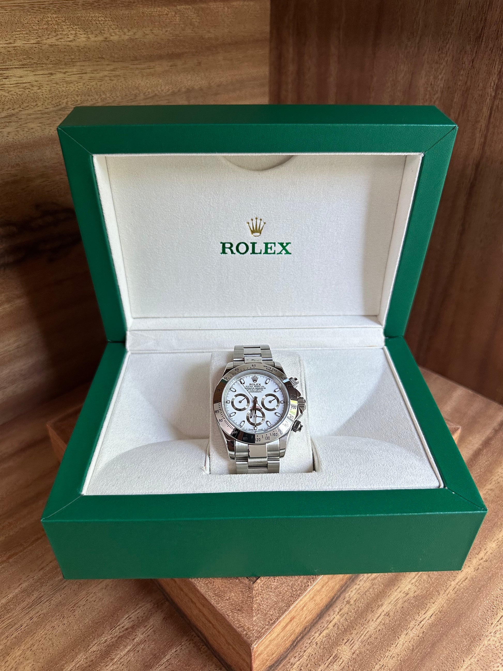 El Daytona Cosmograph con movimiento Zenith y carátula blanca es una referencia histórica y muy apreciada por los coleccionistas. Su diseño limpio y equilibrado combina la elegancia de la esfera clara con la fuerza de sus subesferas en contraste, otorgándole un estilo deportivo y sofisticado. Este modelo marcó una etapa clave en la evolución del Daytona, al incorporar uno de los movimientos más reconocidos de la relojería contemporánea. Más que un cronógrafo, es un símbolo de legado y exclusividad que refleja la pasión por la precisión y el prestigio de Rolex.