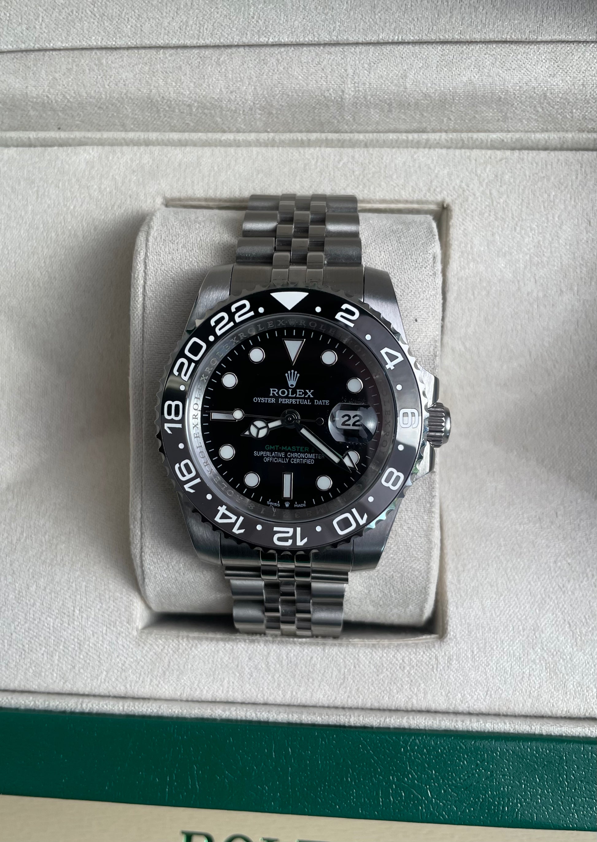 La versión Jubilee del GMT-Master II “Bruce Wayne” conserva la estética oscura y elegante del modelo, pero con un enfoque más refinado. El brazalete Jubilee, con su diseño de cinco eslabones, aporta un toque de sofisticación y comodidad superior. Es la opción perfecta para quienes desean un reloj con presencia formal, sin renunciar al estilo contemporáneo ni a la funcionalidad GMT.