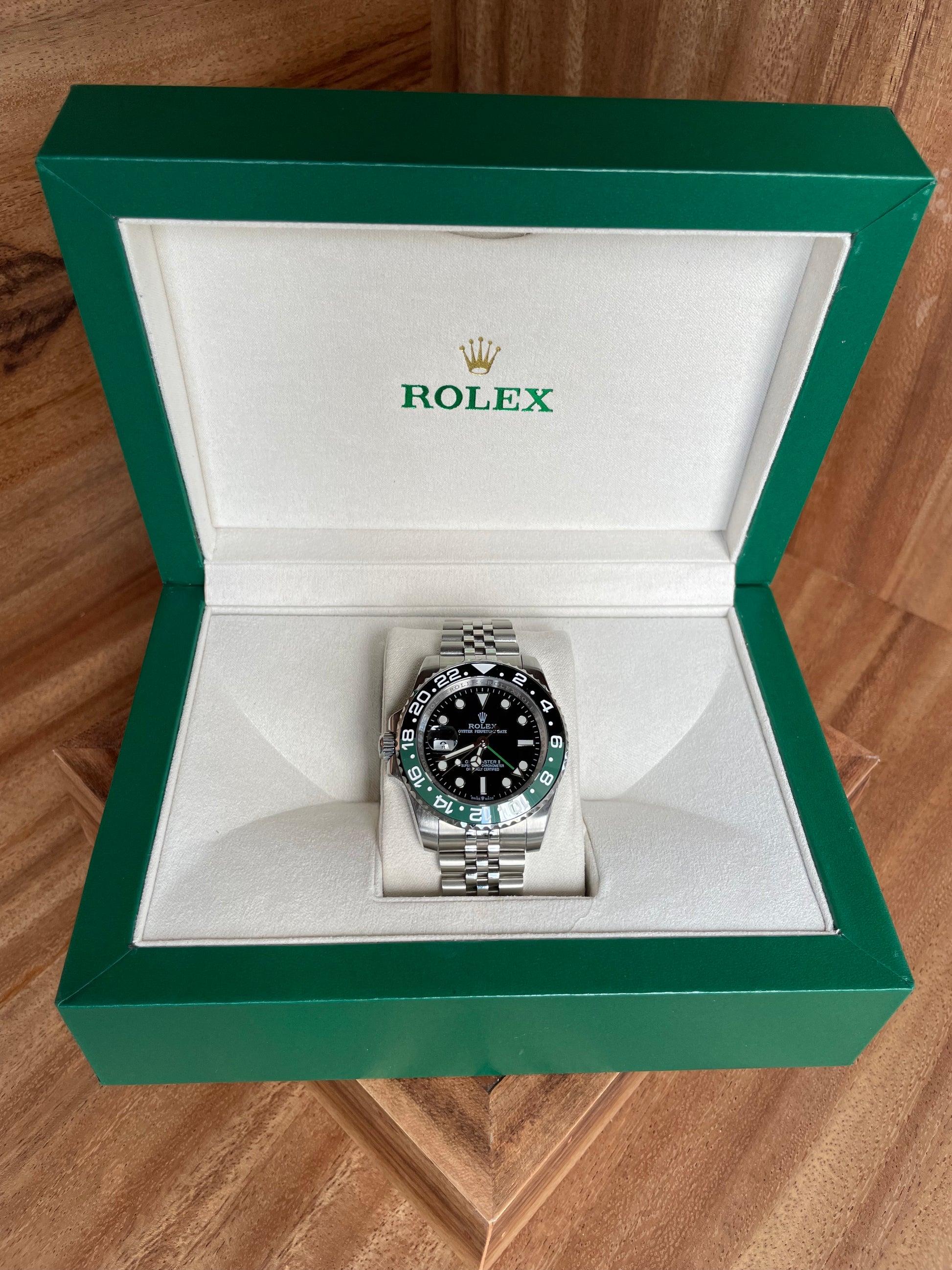 El GMT-Master II “Sprite” rompe los esquemas con su configuración para zurdos, corona a la izquierda y bisel verde y negro. Su diseño asimétrico aporta una identidad fresca y moderna, sin sacrificar la funcionalidad de doble huso horario que lo hace ideal para los viajeros contemporáneos.
