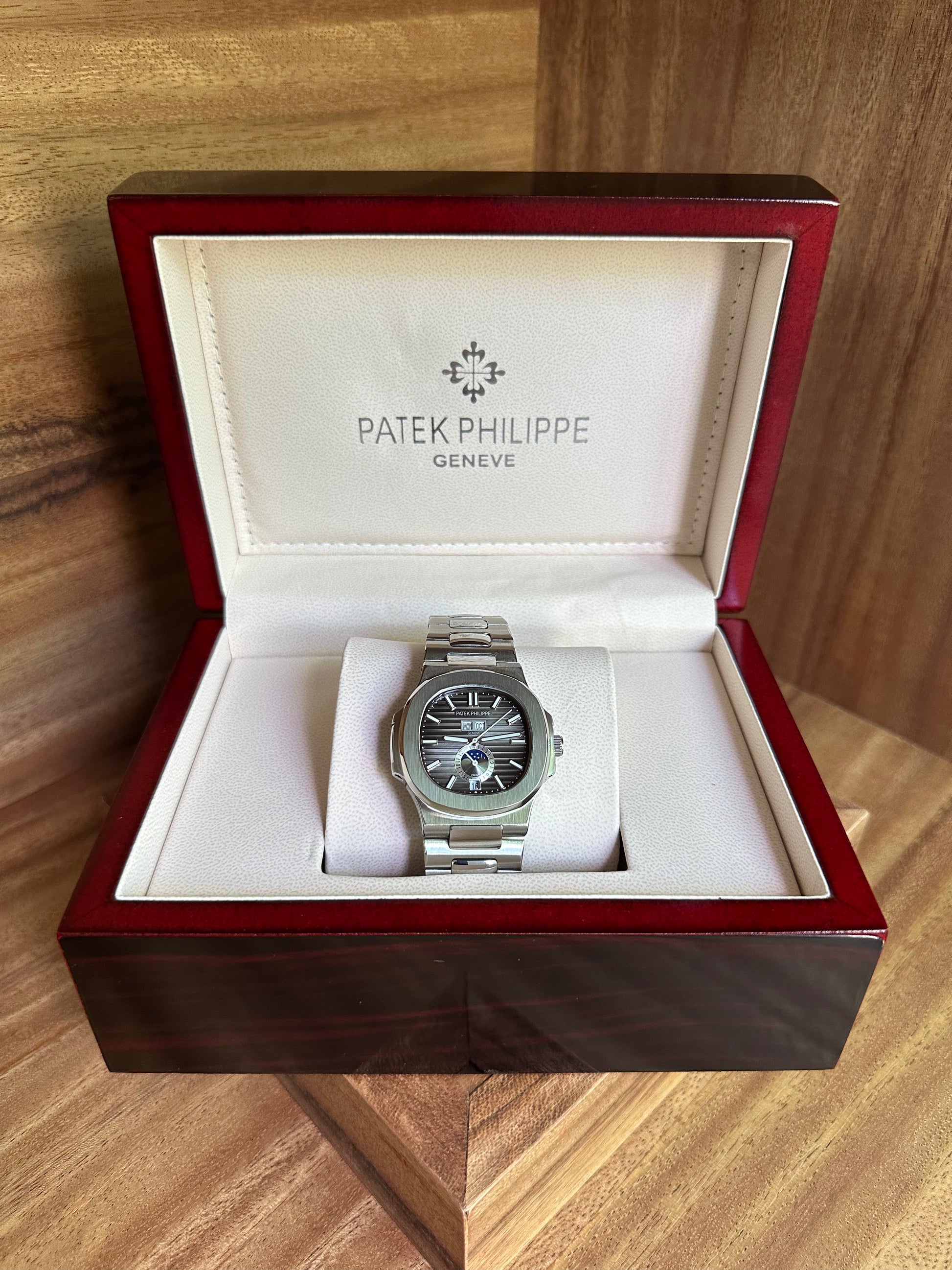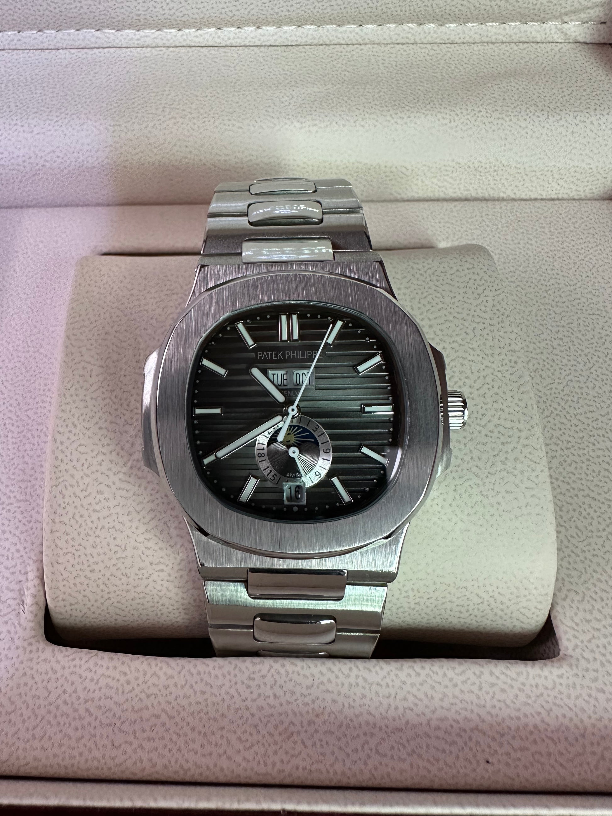 El Patek Philippe Nautilus Moon Phase & Annual Calendar con carátula negra combina complicaciones clásicas con la estética deportiva y refinada del icónico modelo. Su esfera oscura realza la lectura de las funciones y aporta un aire de sobriedad y elegancia, mientras que la integración de fases lunares y calendario anual subraya el prestigio y la maestría relojera de la pieza. Un reloj que destaca tanto por su diseño como por su sofisticación técnica.