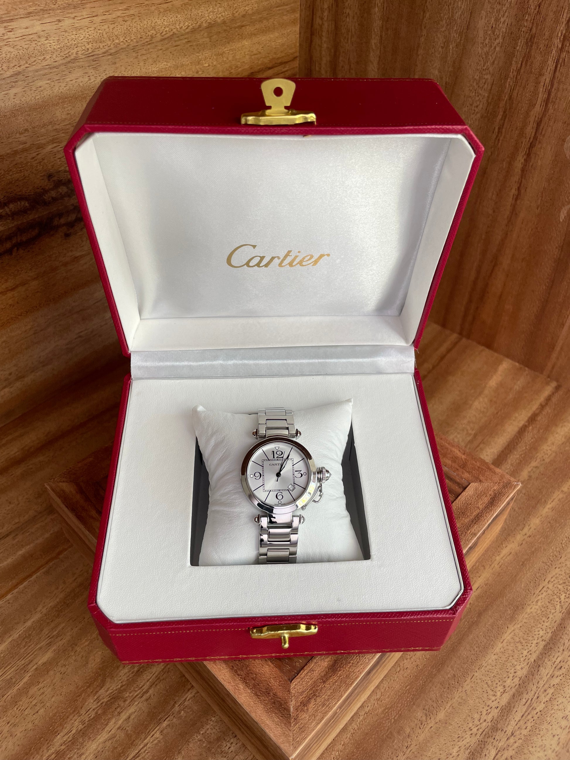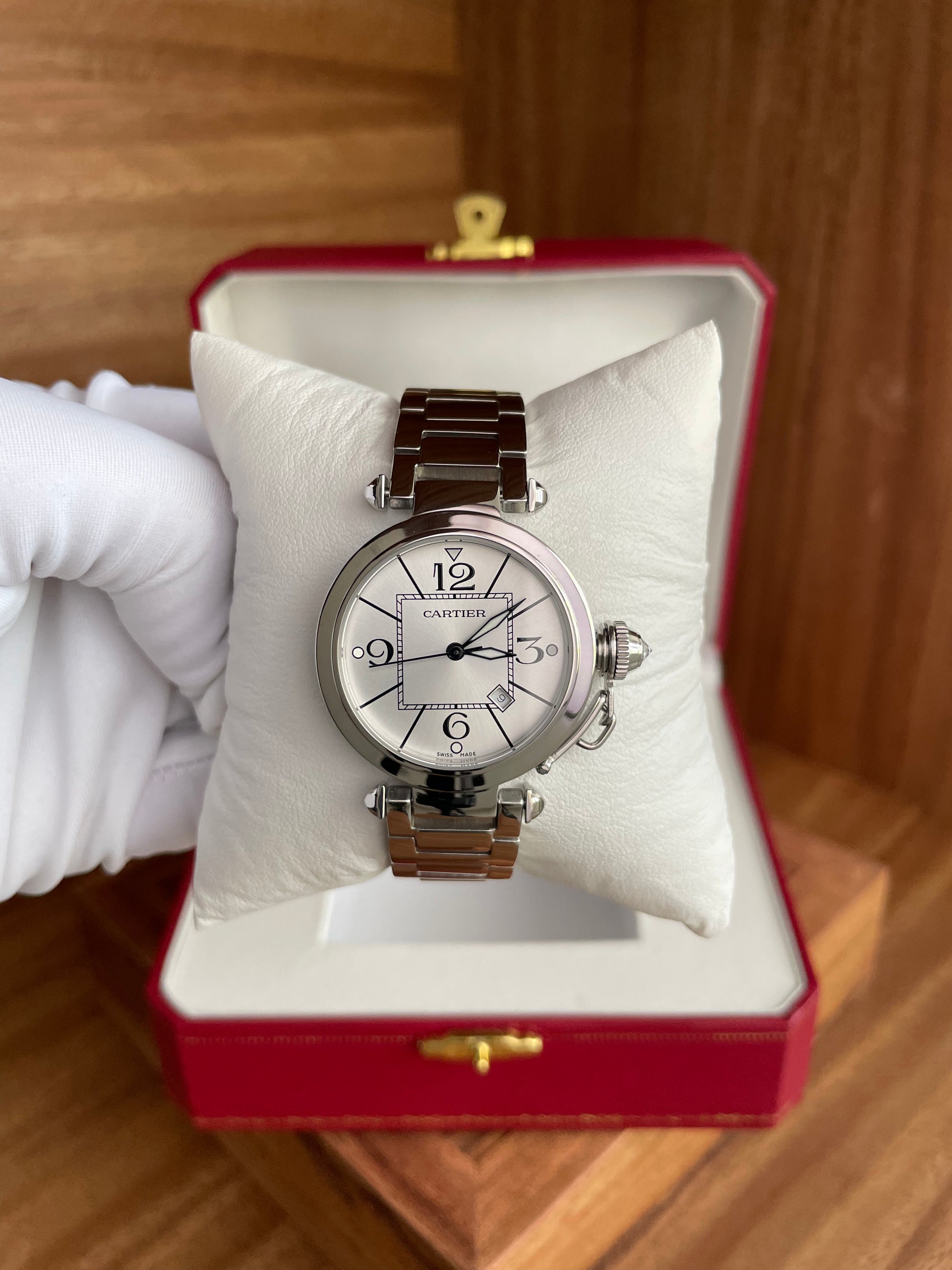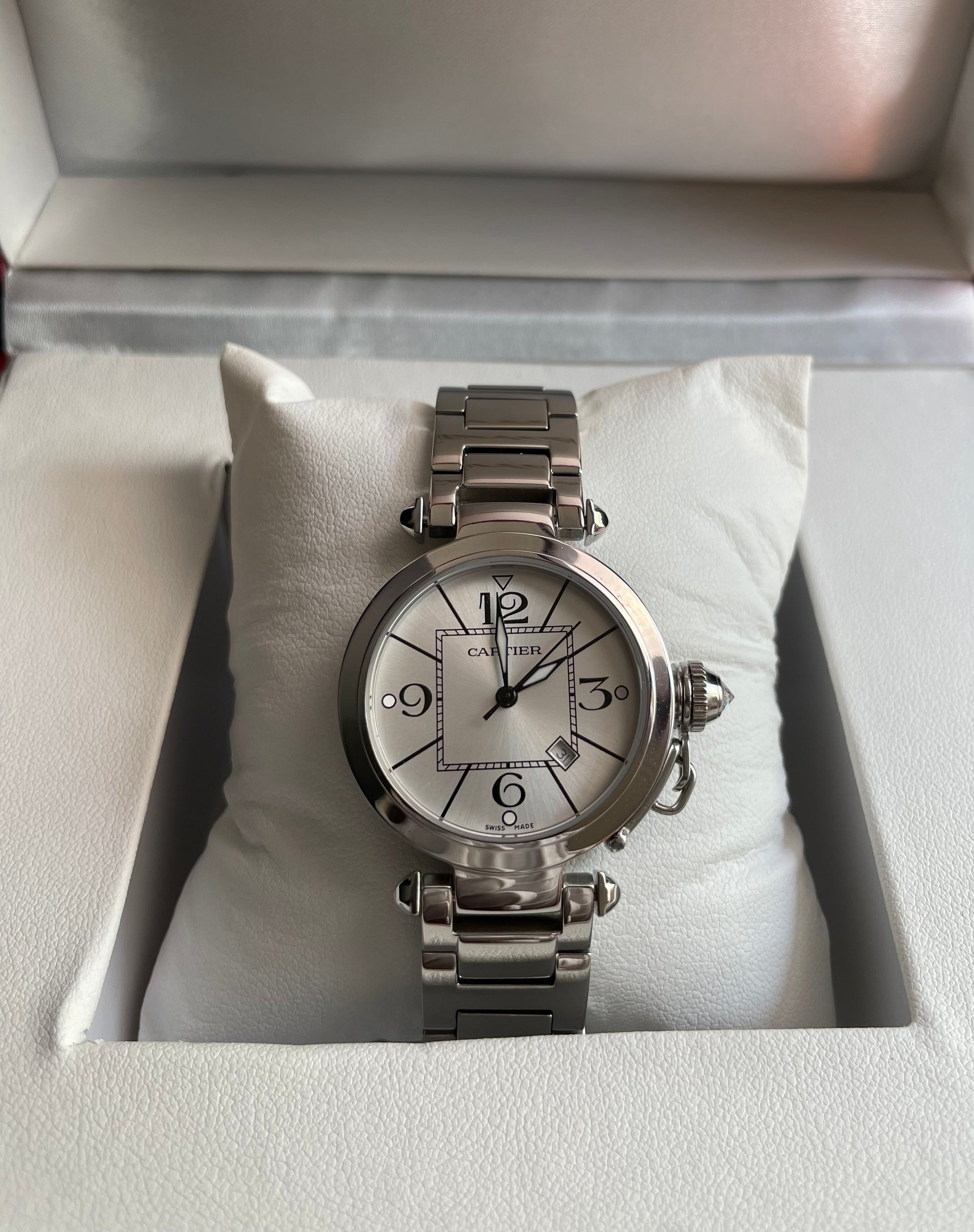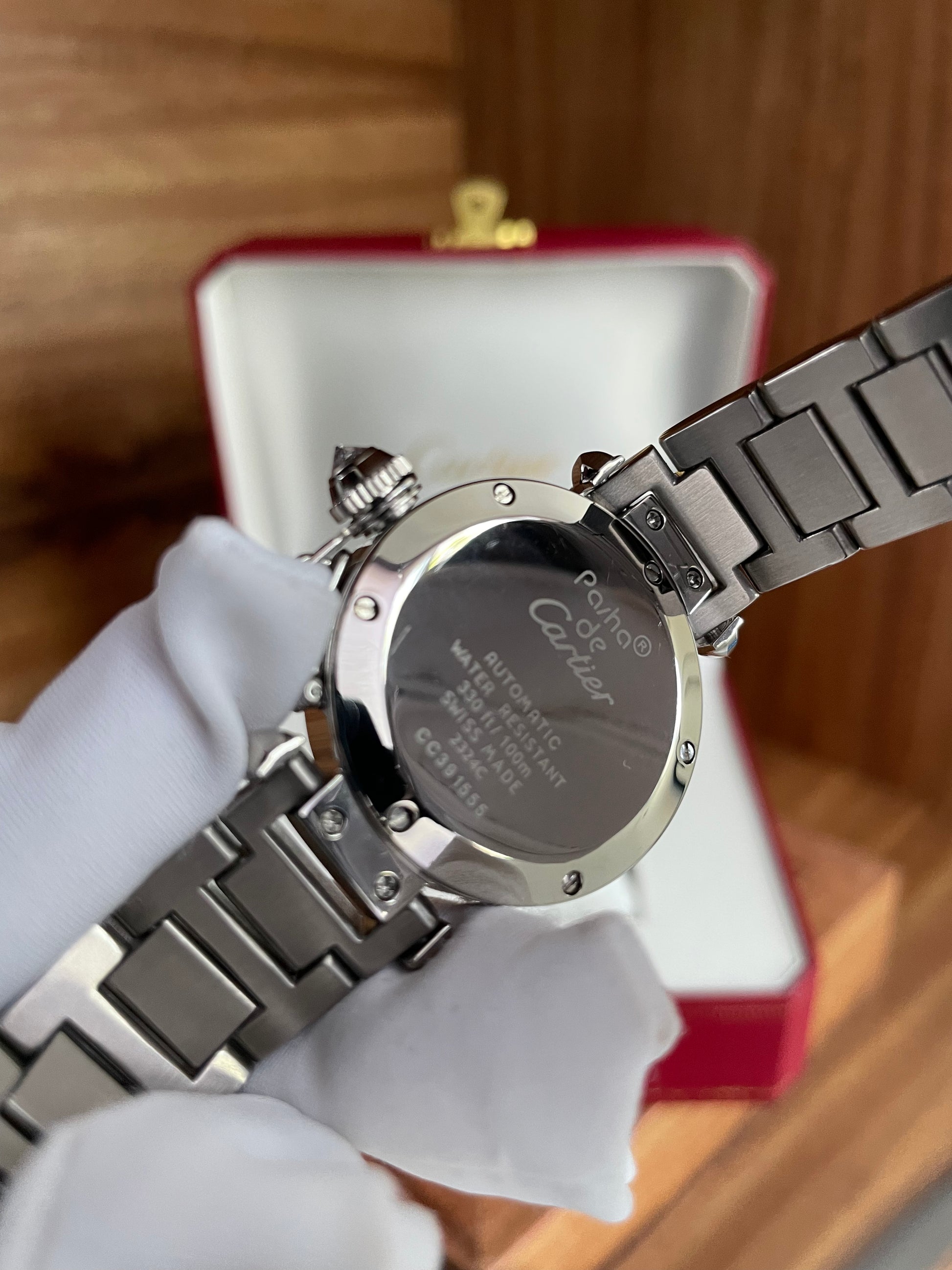 El Pasha C se caracteriza por su diseño redondo y distintivo, con corona atornillada protegida por una cadena. Su esfera blanca ofrece gran legibilidad y un aire náutico refinado. Es un modelo que equilibra lo clásico y lo contemporáneo.