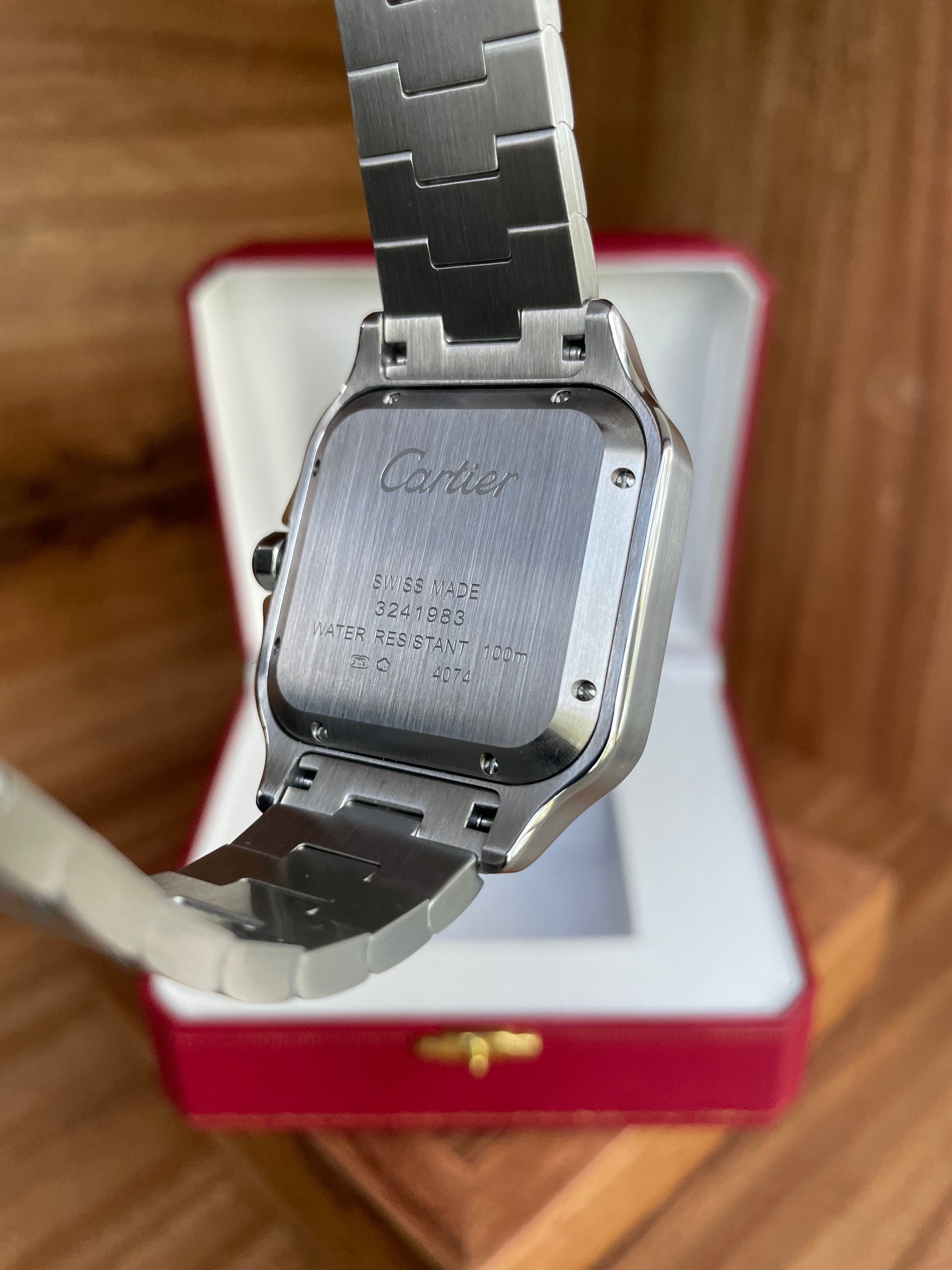 Una propuesta fresca y audaz. La esfera verde ofrece un aspecto vibrante y poco convencional, ideal para quienes buscan un reloj distintivo. Este color no solo es tendencia, sino que también resalta con elegancia en la icónica caja cuadrada del Santos.