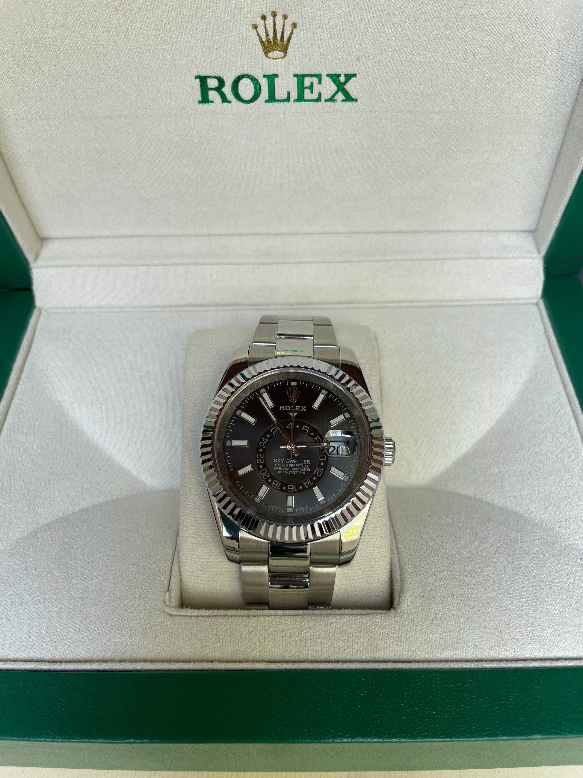 La versión con esfera negra del Sky-Dweller presenta un diseño más sobrio y versátil, sin perder la sofisticación del modelo. Su visual monocromática acentúa las funciones del calendario y la hora de referencia, en una pieza que transmite control, orden y poder.