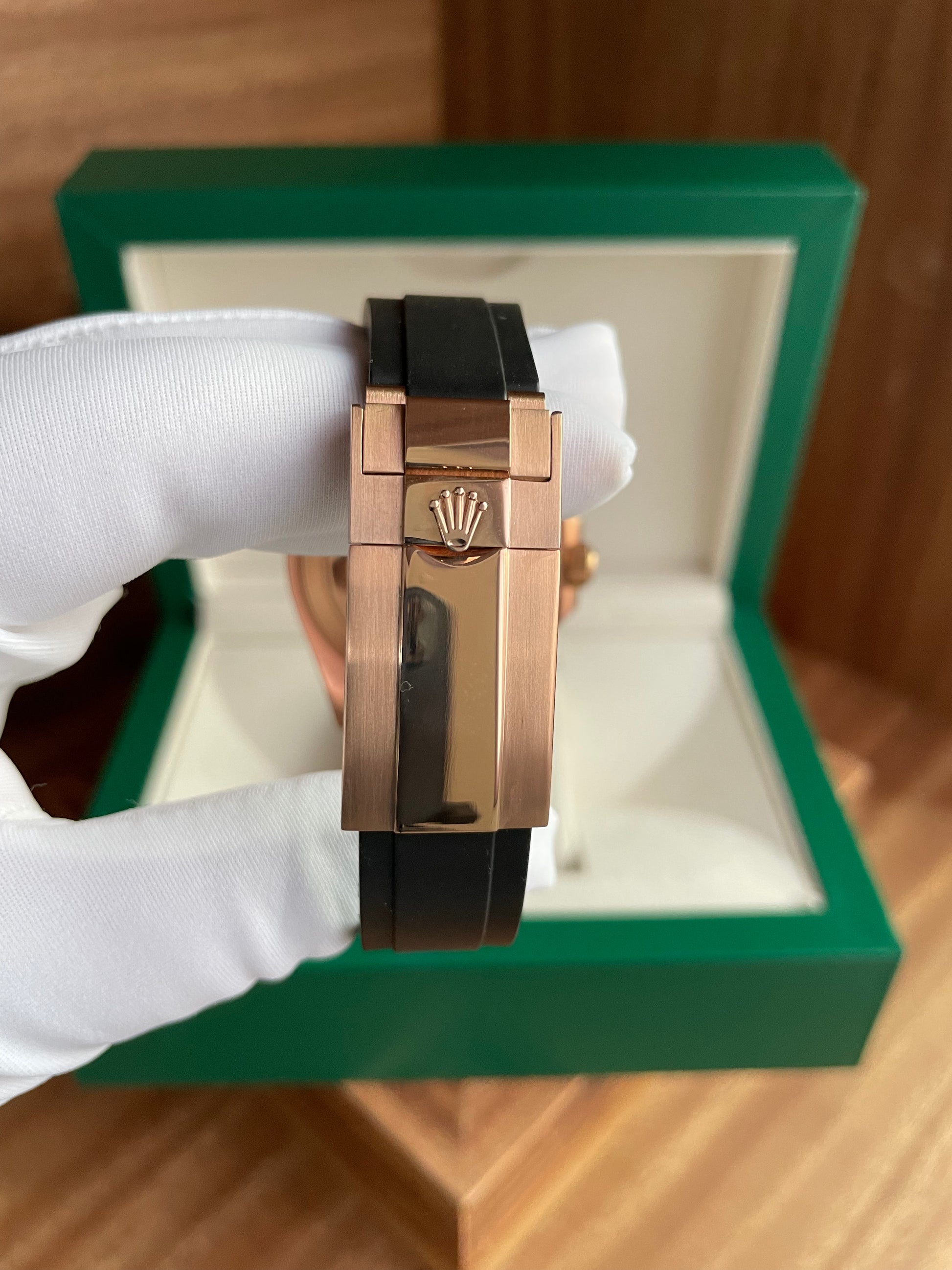 El Rolex Yacht-Master en oro rosa con brazalete Oysterflex combina lujo deportivo con innovación técnica. Su caja de 40 mm está fabricada en color oro rosado, mientras que el bisel giratorio bidireccional con inserto de cerámica negra mate resalta su estilo náutico. La correa Oysterflex, con alma metálica recubierta de elastómero, ofrece la comodidad de una pulsera deportiva con la resistencia de un brazalete metálico. Equipado con el calibre 3235, es preciso, robusto y sofisticado: ideal para quienes buscan rendimiento y distinción en un solo reloj.